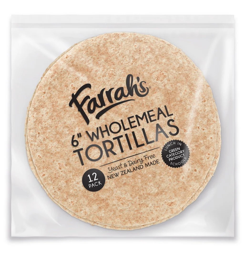 Farrah’s 6” Wholemeal Tortillas are made using the finest plain and wholemeal wheat flour. They’re light and soft with a smooth edge and can be used straight from the pack. An ambient product, with a 120-day shelf-life (unopened) from the date of manufacture, they’re best stored in your dry store, even after opening. Extremely versatile - filled, folded, wrapped, stacked or baked in a wide range of wrap recipes.