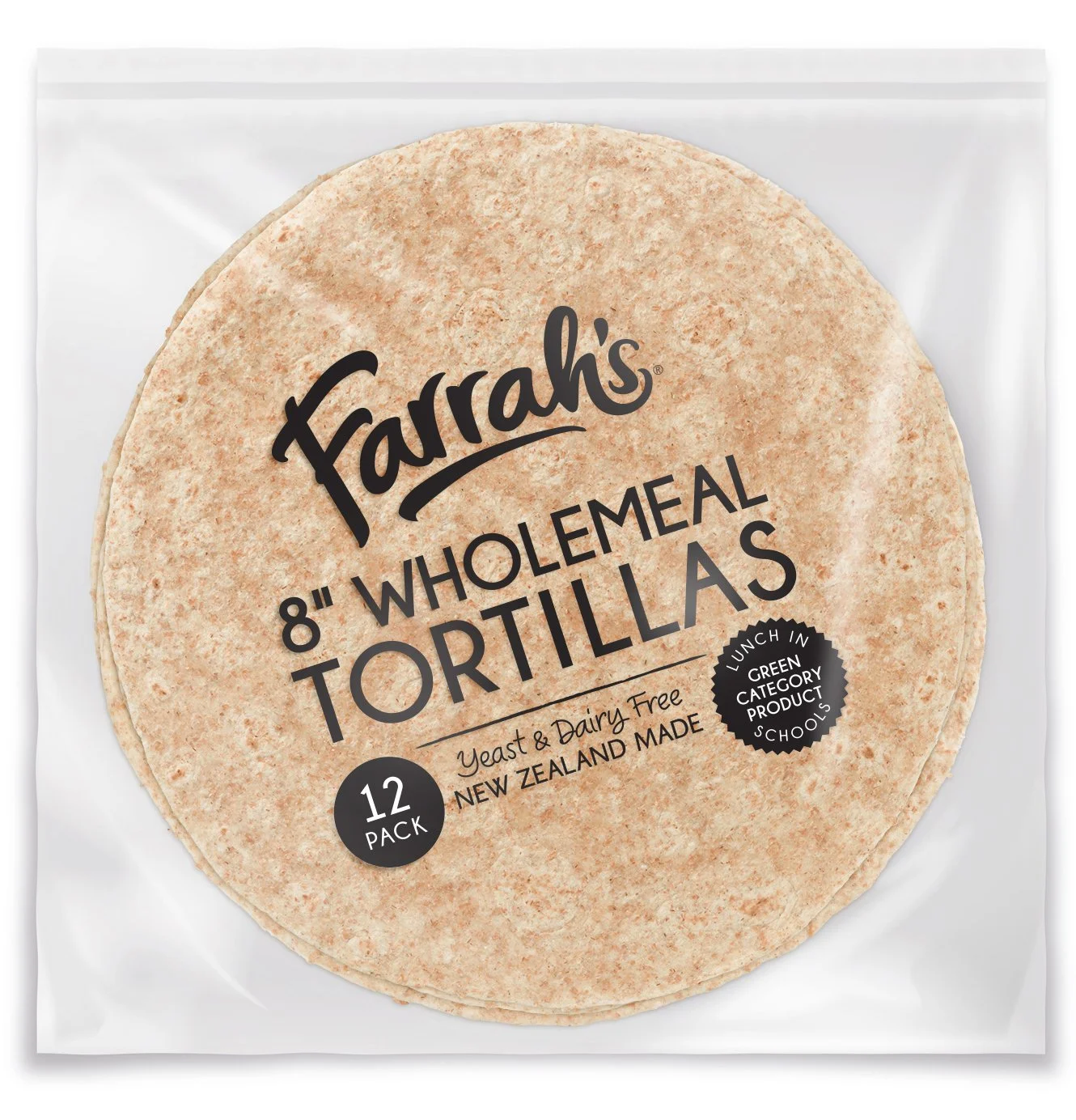 Farrah’s 8” Wholemeal Tortillas are made using the finest plain and wholemeal wheat flour. They’re light and soft with a smooth edge and can be used straight from the pack. An ambient product, with a 120-day shelf-life (unopened) from the date of manufacture, they’re best stored in your dry store, even after opening. Extremely versatile - filled, folded, wrapped, stacked or baked in a wide range of wrap recipes.