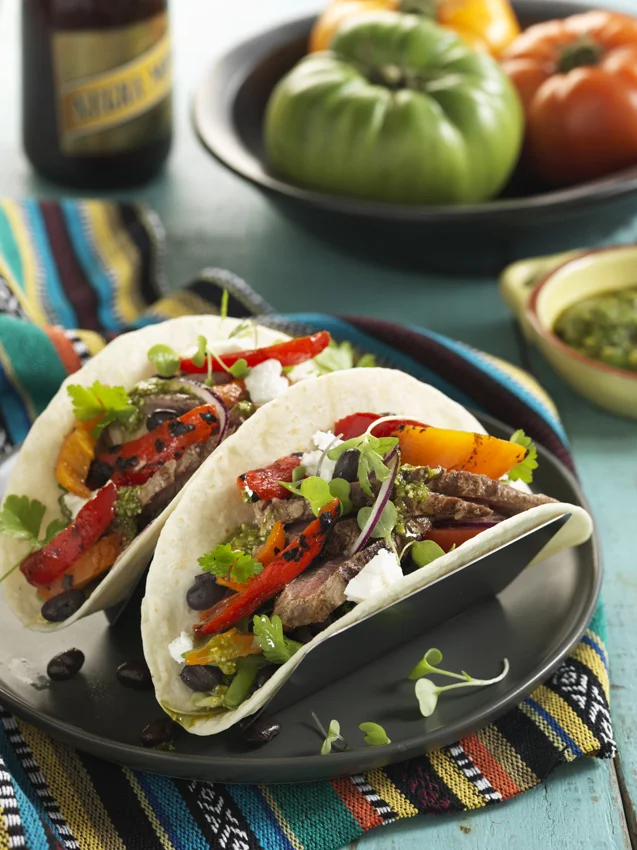 Warm your flour tortilla in a hot plate or pan, start building your taco with a few black pinto beans, micro leaf salad, red and yellow peppers, crumbed goats cheese, few slices of thinly sliced red onion and top off with a drizzle of Salsa Verde.