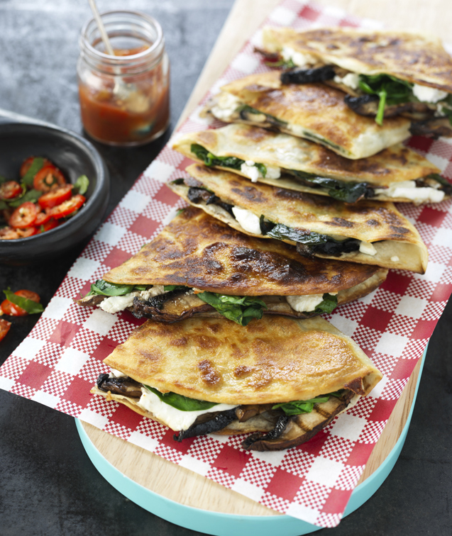 Lay one tortilla down flat on the bench. Layer with a light sprinkle of cheddar cheese that binds the Quesadilla, add the cooked mushrooms, sliced goats cheese, baby spinach leaves and season with black pepper. Top with another tortilla and gently place in a heated and lightly oiled frying pan or sandwich press.