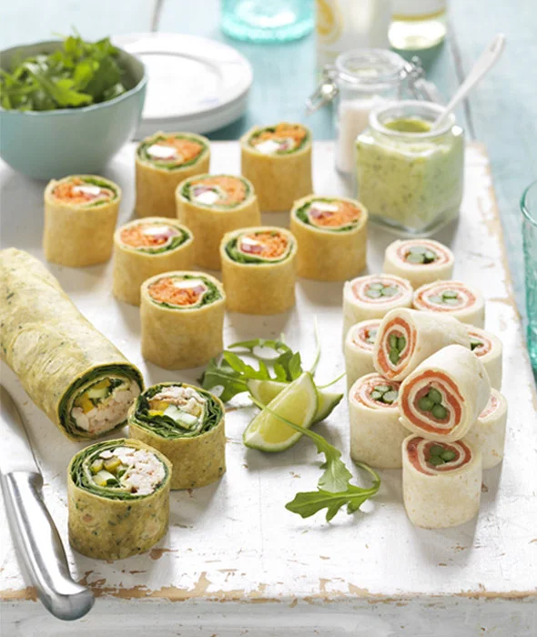 Lay a wrap flat on a chopping board and spread one side with cream cheese, all the way to the edges of the wrap.