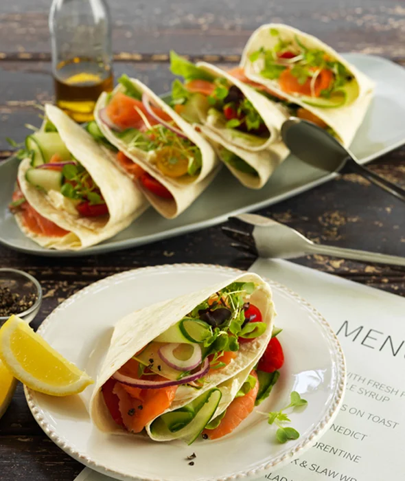 Fill the pockets using the smoked salmon, watercress, cucumber, cherry tomatoes and red onion.